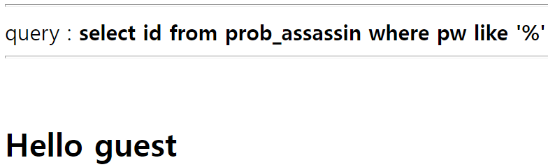 ⇒ Hello admin이 뜨지 않고 Hello guest가 떴다면, 이는 admin 계정과 guest 계정의 pw 첫번째 문자가 겹친다는 뜻이다. 둘의 문자가 같을 시 테이블 상 첫번째 레코드인 guest 계정이 fetch 되기 때문이다.