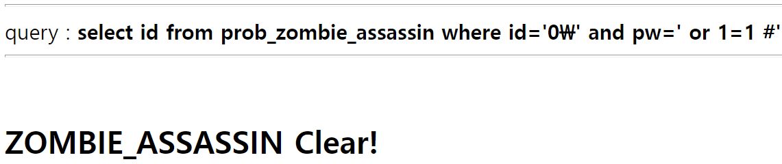 $query = "select id from prob_zombie_assassin where id='{$_GET[id]}' and pw='{$_GET[pw]}'";