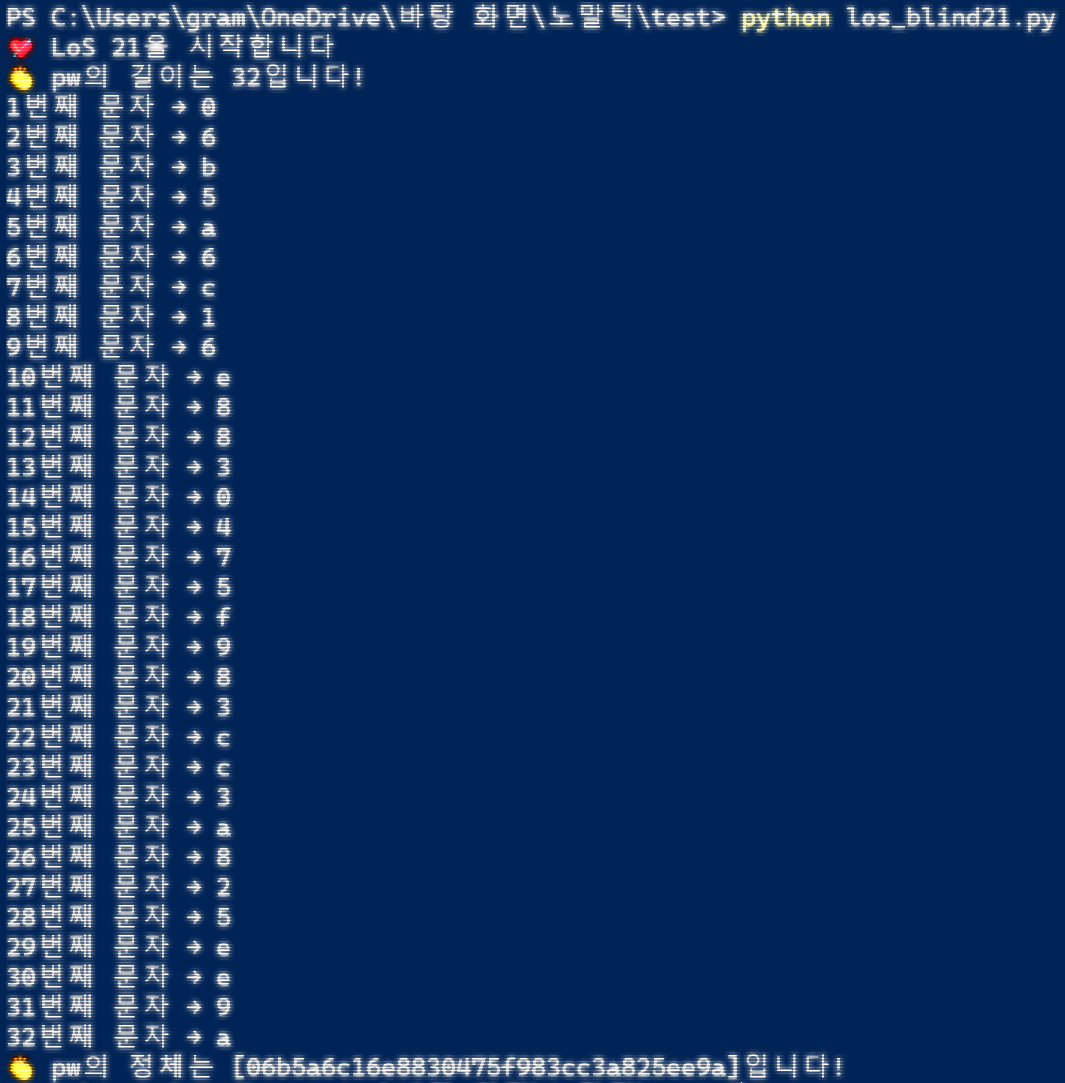 Blind 공격 결과, pw는 06b5a6c16e8830475f983cc3a825ee9a 임을 확인할 수 있다.
