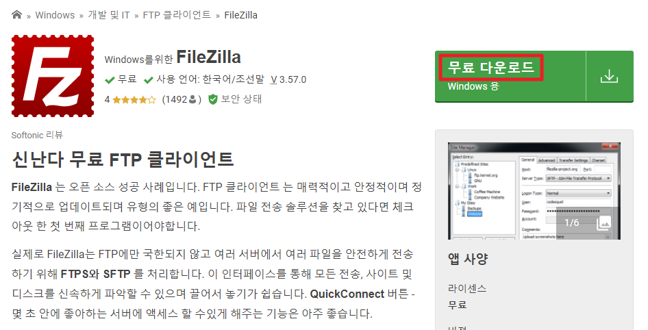 [1] FileZilla를 다운받아서 설치한다. → https://filezilla.softonic.kr/