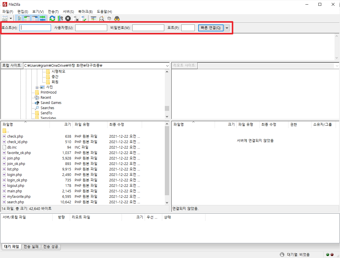 [1] FileZilla를 실행하면 다음과 같은 화면을 볼 수 있다.