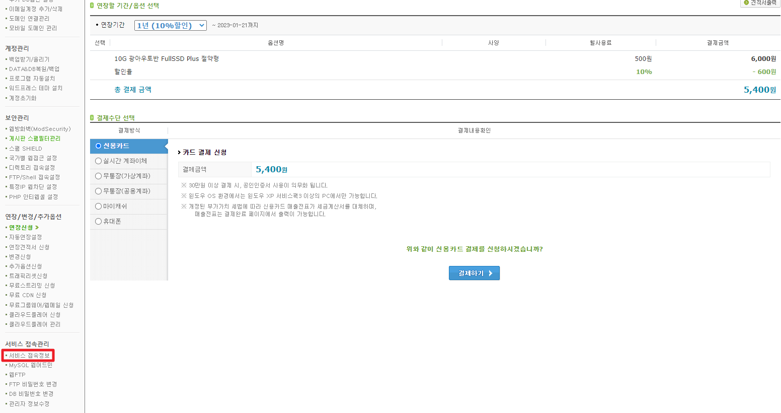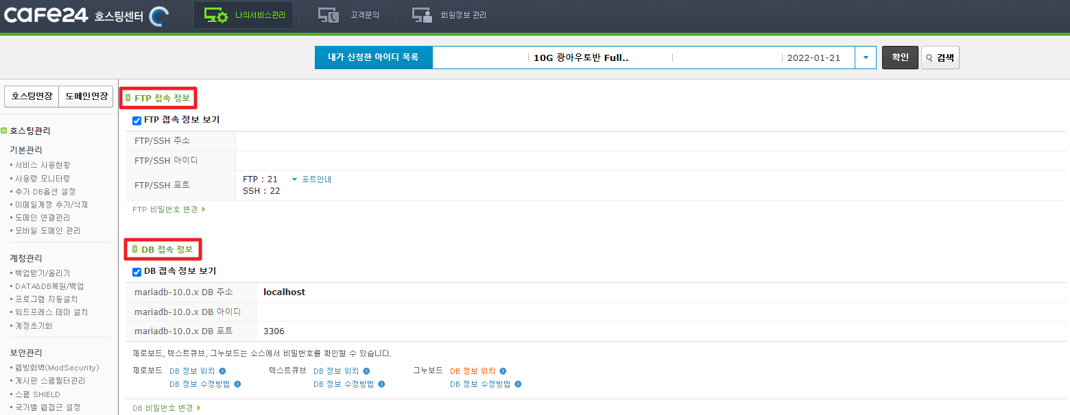 [11] 해당 메뉴로 들어오면, FTP/SSH 및 DB 접속 정보를 확인할 수 있다.