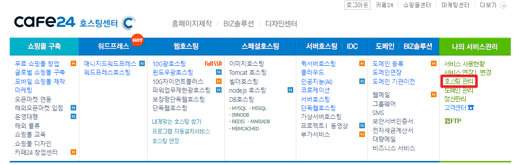[8] 신청이 완료되면, 다시 메인페이지로 돌아온 후 네비바 나의 서비스관리 > 호스팅 관리를 클릭한다.