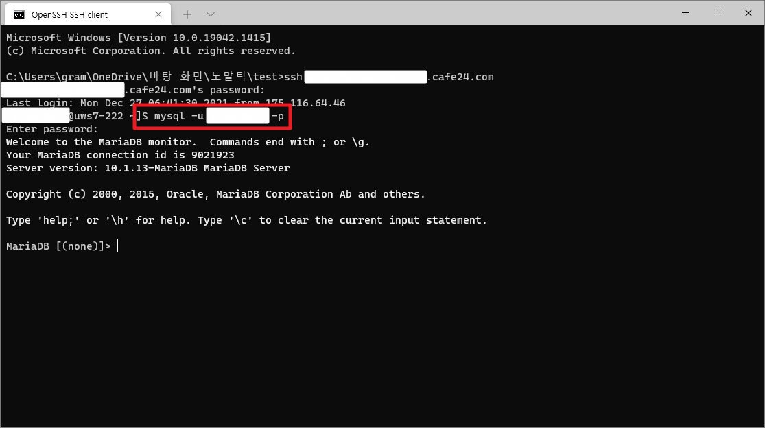 [2] ssh로 웹 서버에 접속한 상태에서 $ mysql -u [신청아이디] -p 를 입력하면 mysql에 접속할 수 있다.