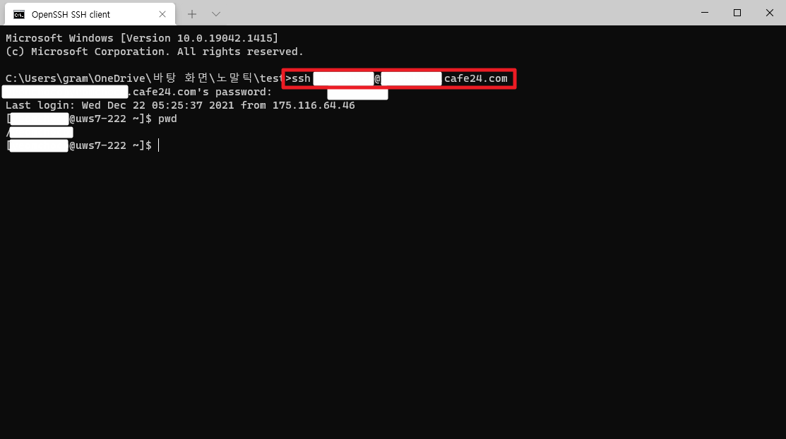 [1] cmd에 $ ssh [신청아이디]@[도메인주소] 를 입력한다.
