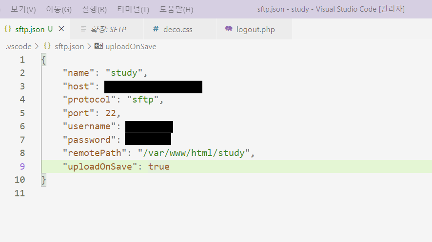 ⑧ uploadOnSave : True일 경우, 로컬에서 변경 사항을 저장할 때마다 서버 파일에 동기화됨
