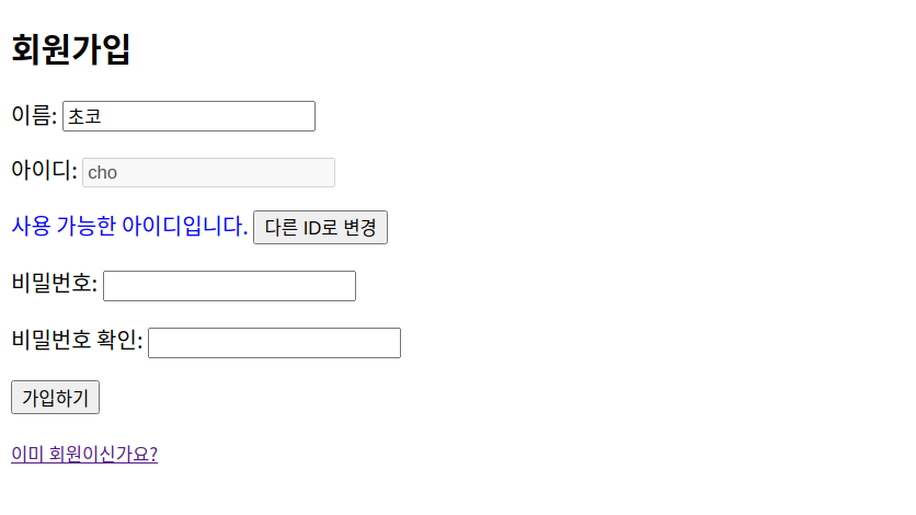 [5] [다른 ID로 변경] 버튼 value를 초기의 [ID 중복 검사]로 변경해준다.