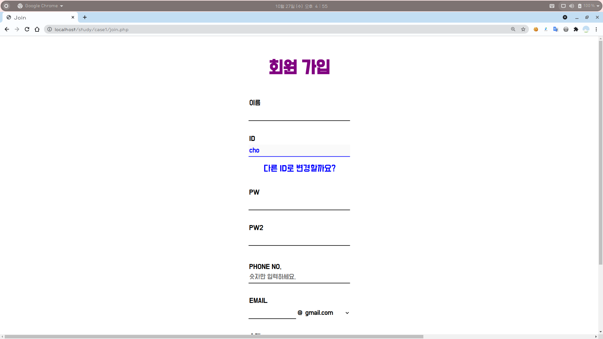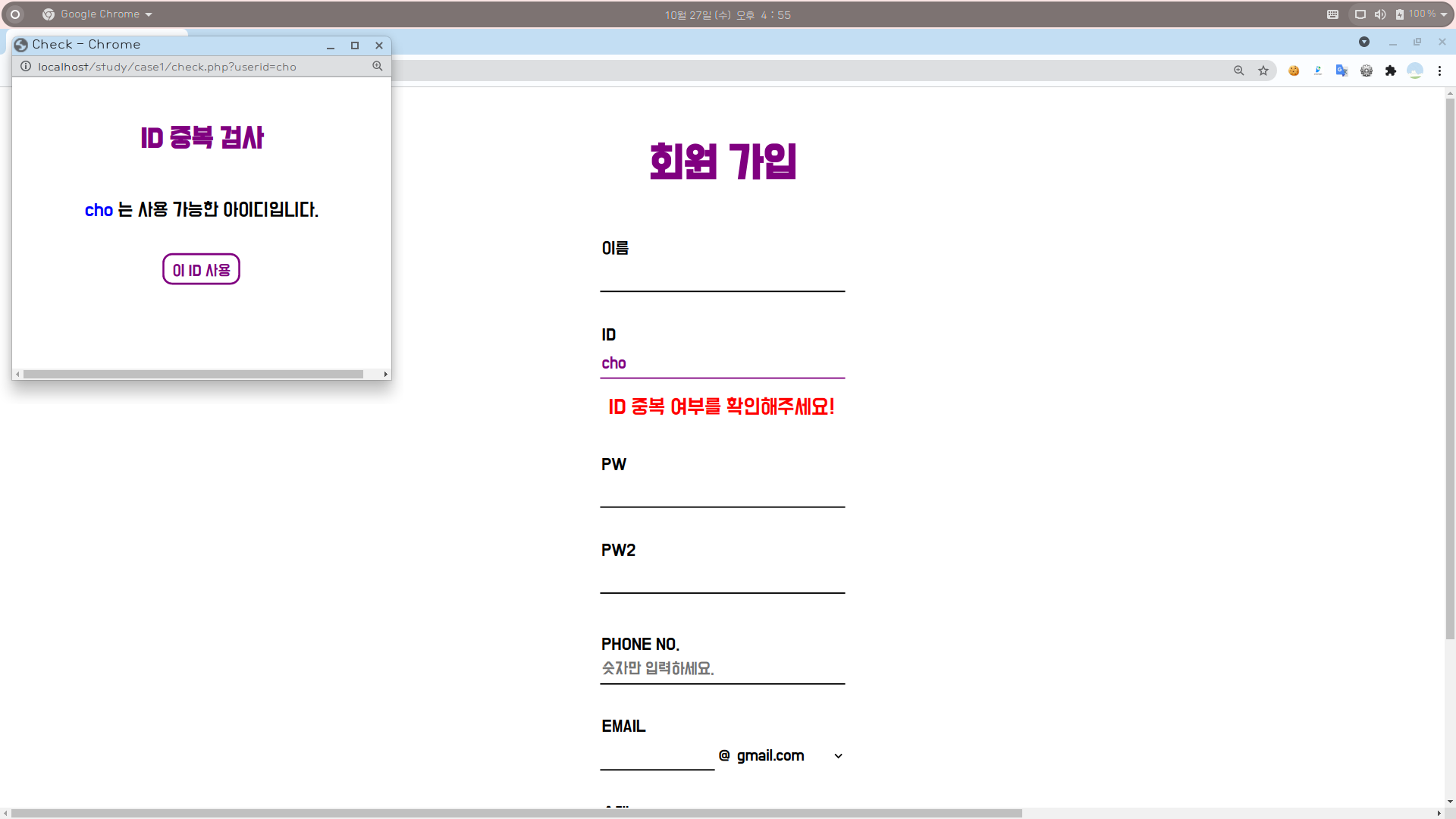 [4] 이후 다른 ID를 입력 후 [ID 중복 여부를 확인해주세요!] 버튼을 누르면, 처음과 똑같이 동작한다.