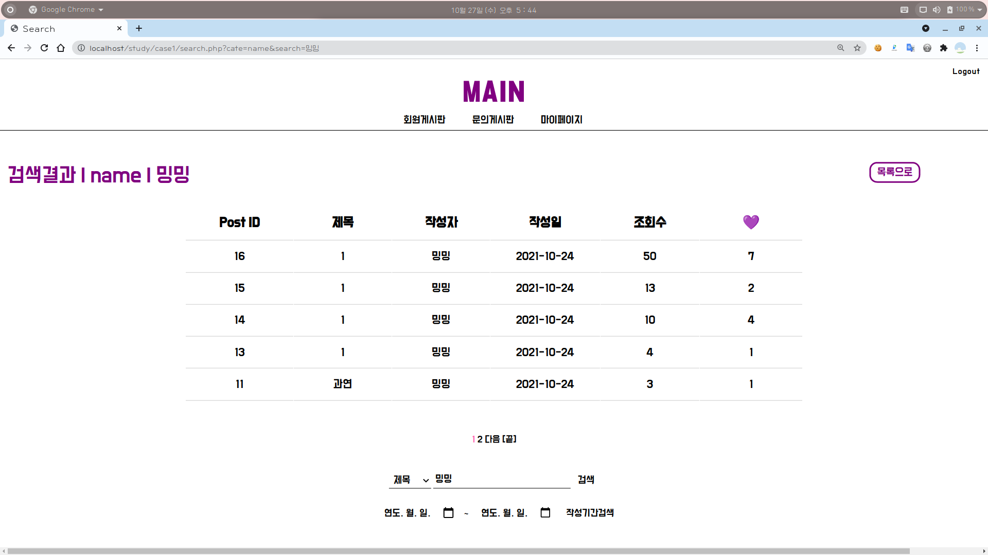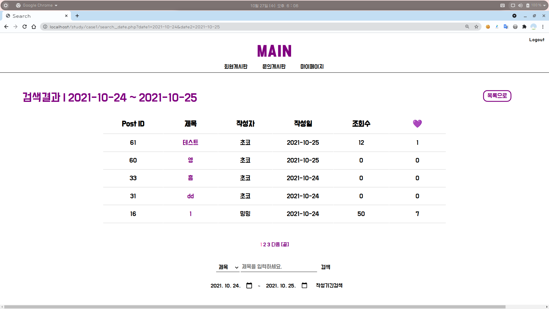 4-2. 회원게시판 화면 : 작성기간으로 검색 (검색 결과 있음)