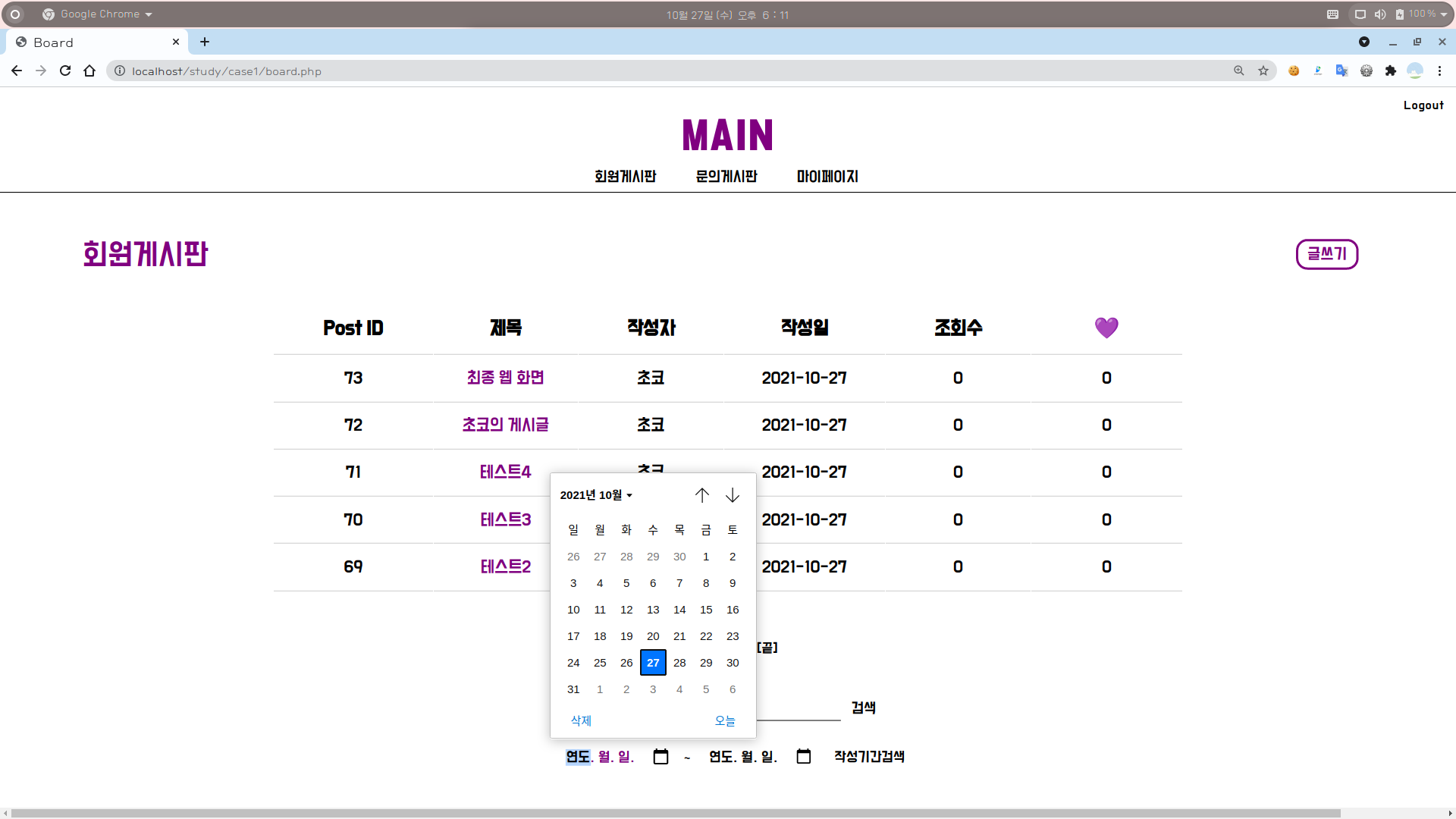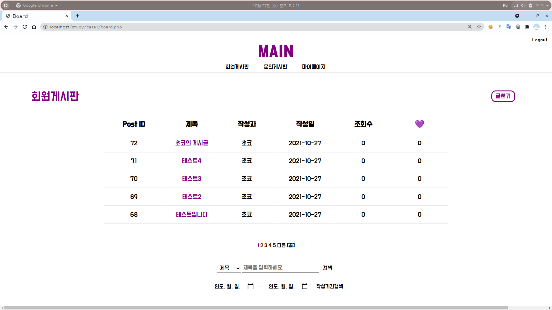4-1. 회원게시판 화면 : 작성기간으로 검색