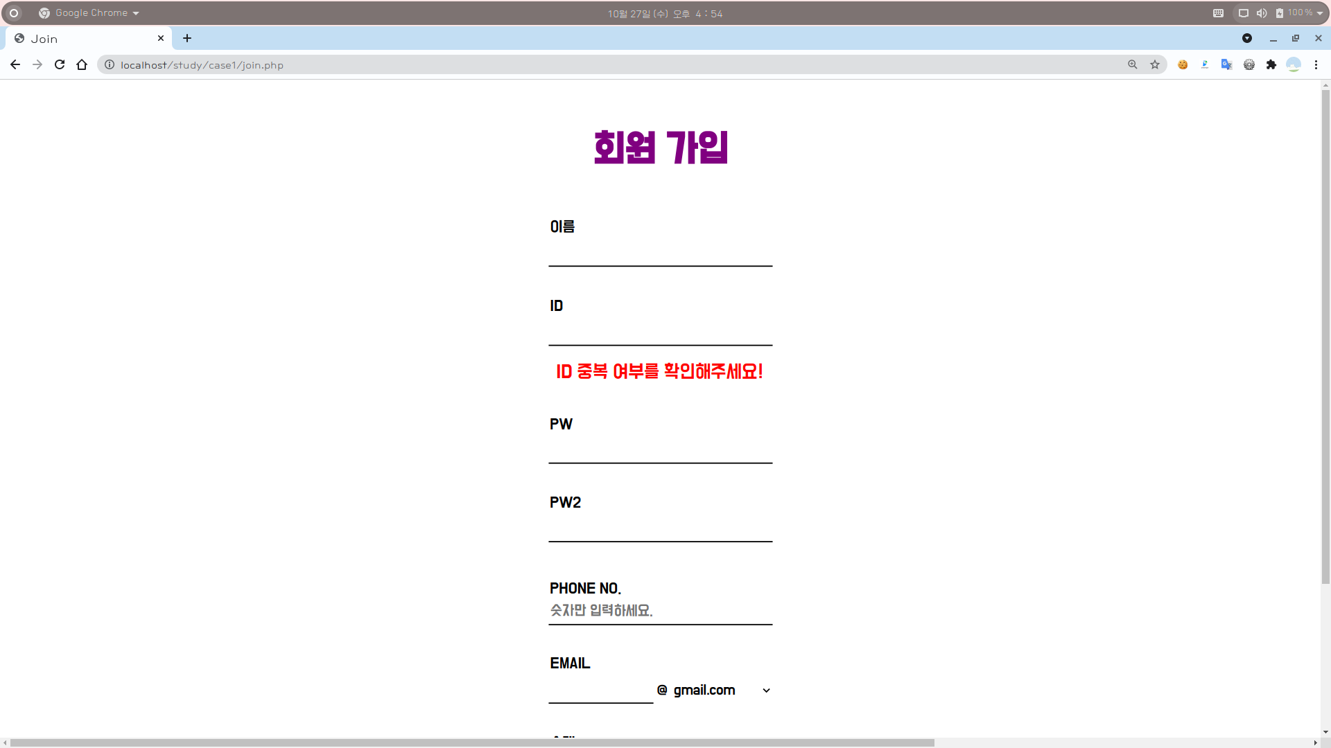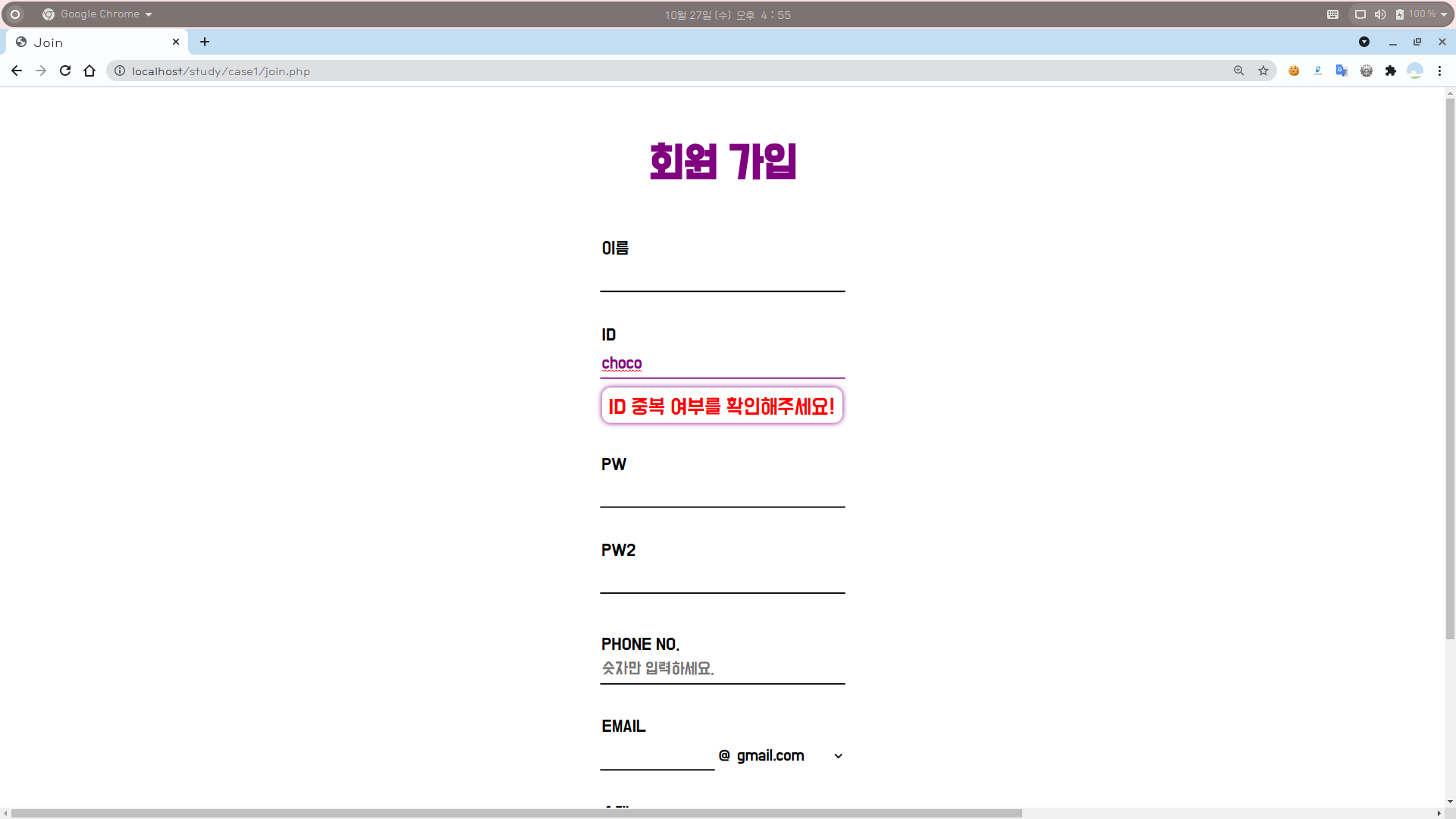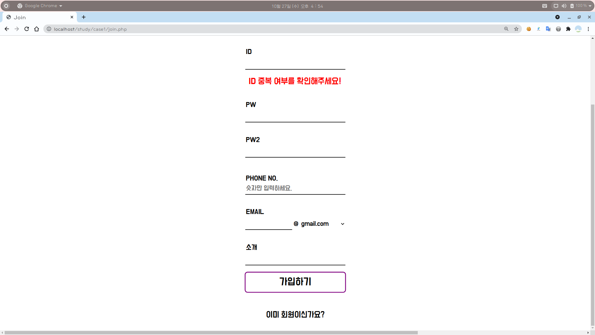 4-2. 회원 가입 화면 : ID 중복 검사 (사용 불가 ID)