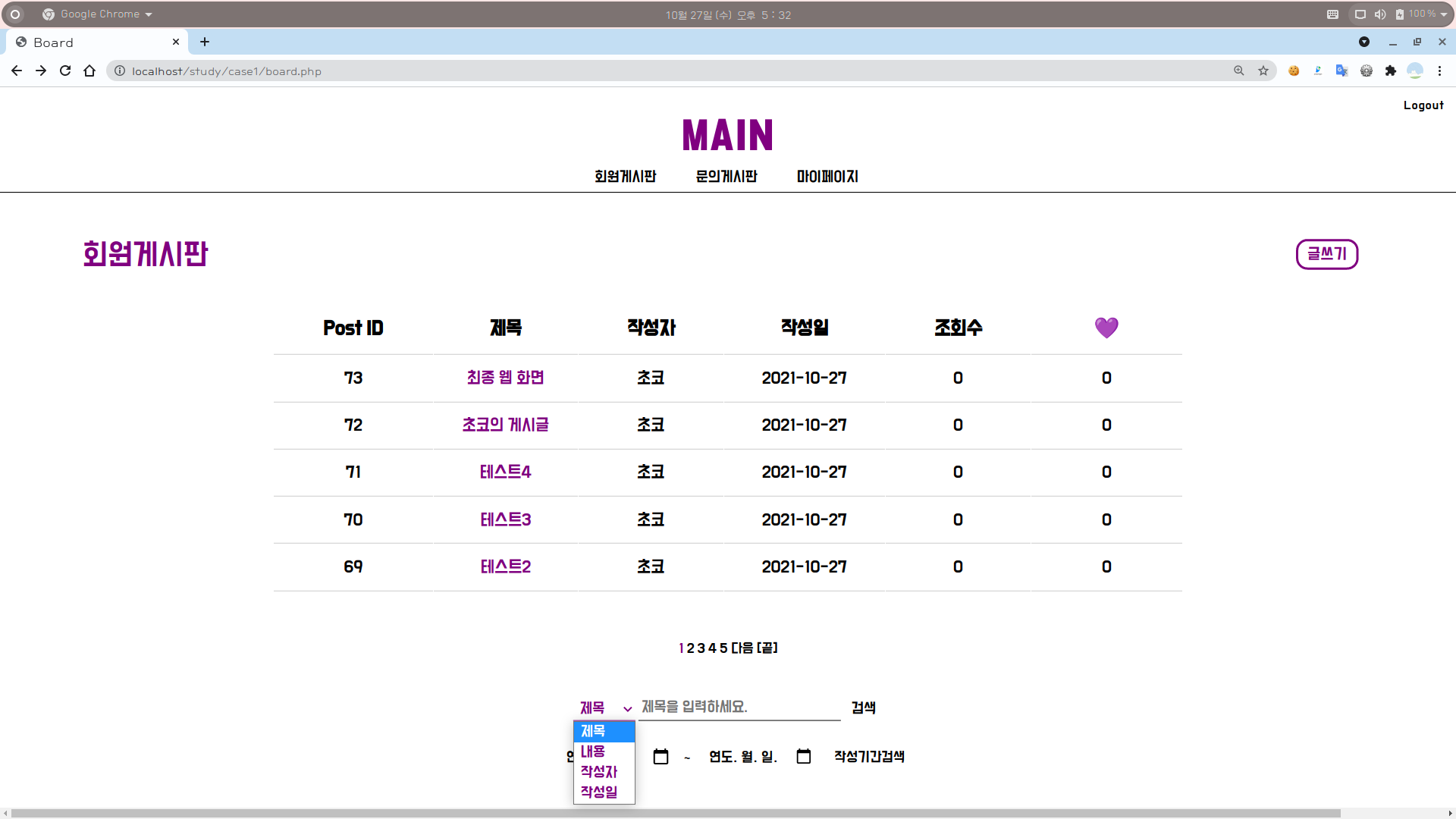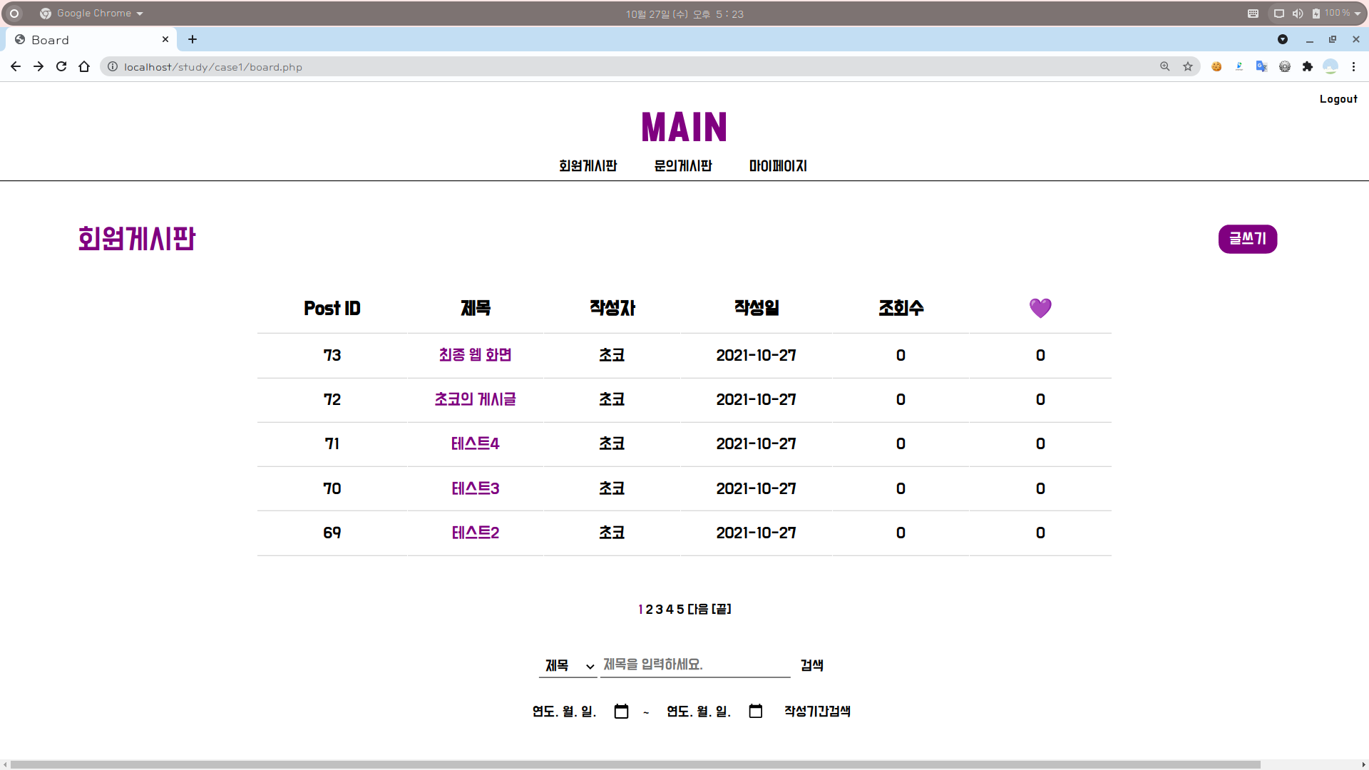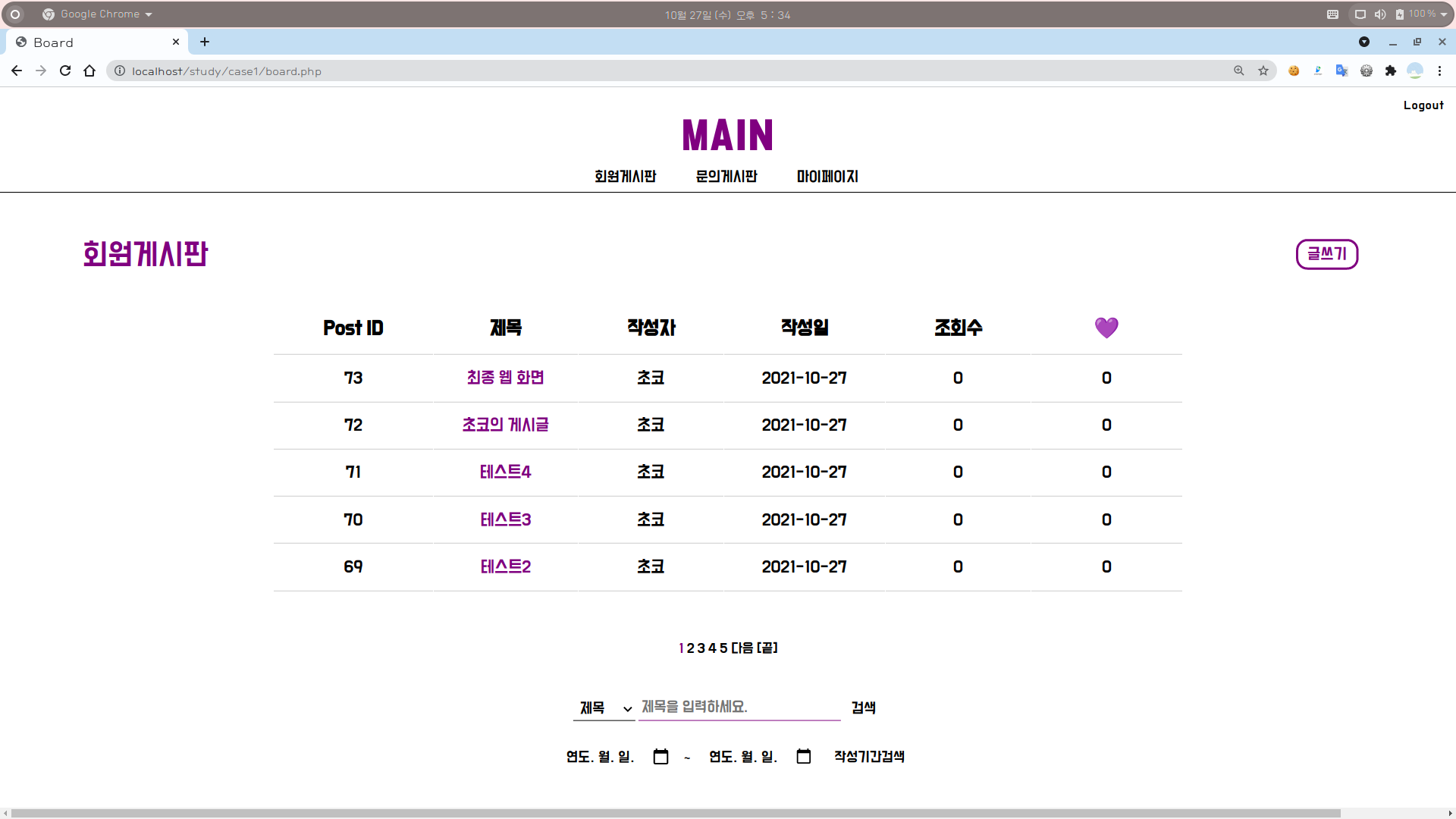 [웹개발] 웹 최종 한 눈에 보기 (1) : 그리팅, 로그인, 회원가입, 메인, 글쓰기, 글조회, 게시판, 검색어로 검색, 작성기간으로 검색