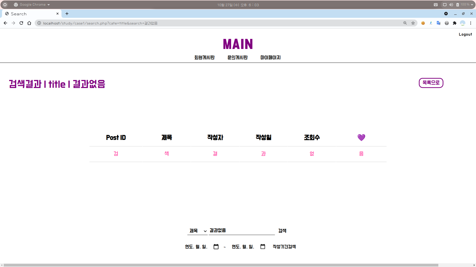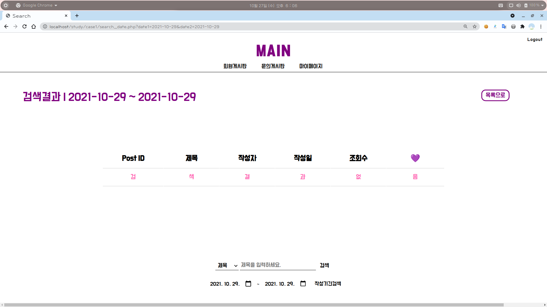 4-2. 회원게시판 화면 : 작성기간으로 검색 (검색 결과 없음)