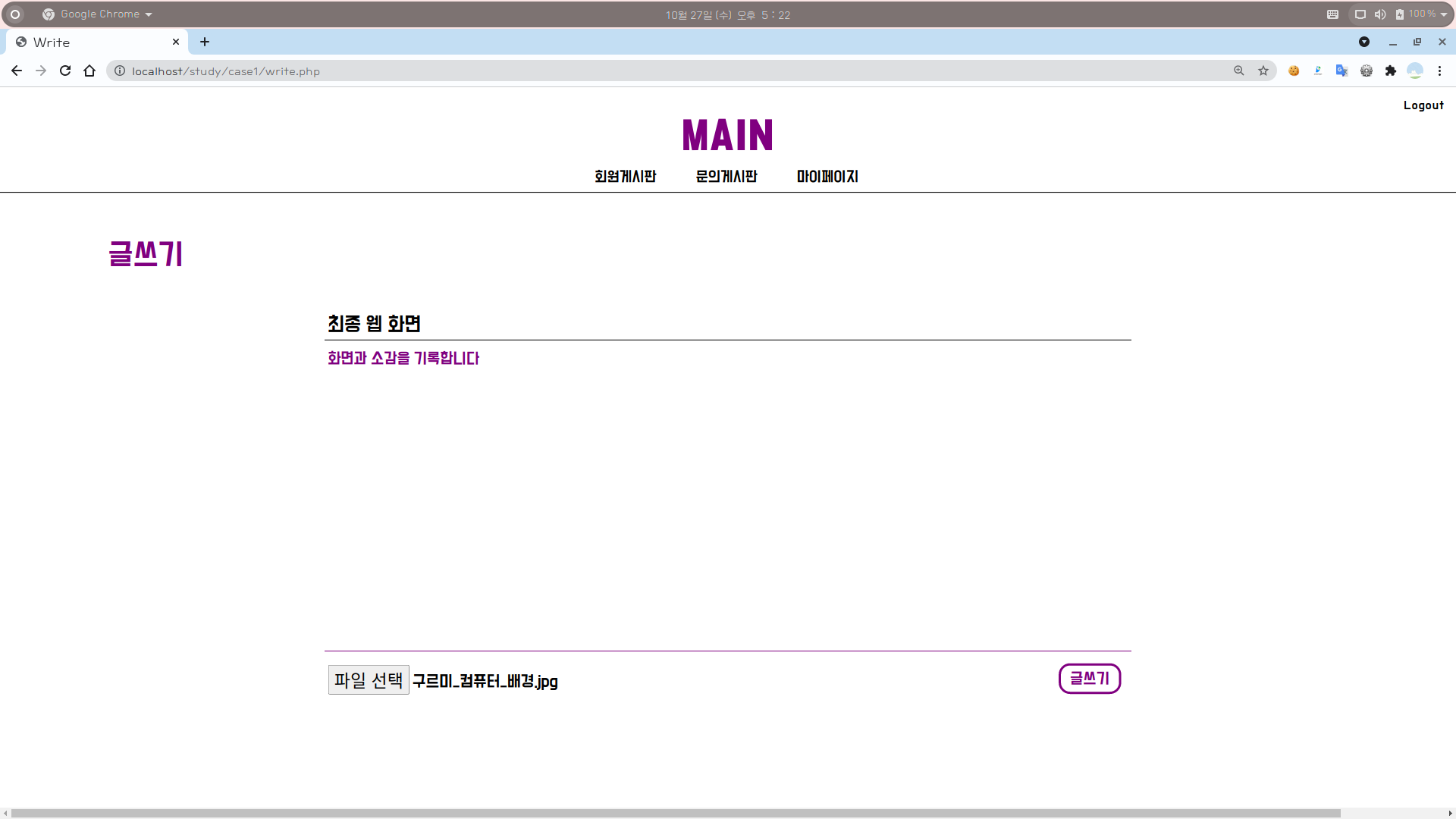 [1] 회원게시판에서 [글쓰기] 버튼을 누르면 위와 같은 글작성 페이지로 넘어간다.