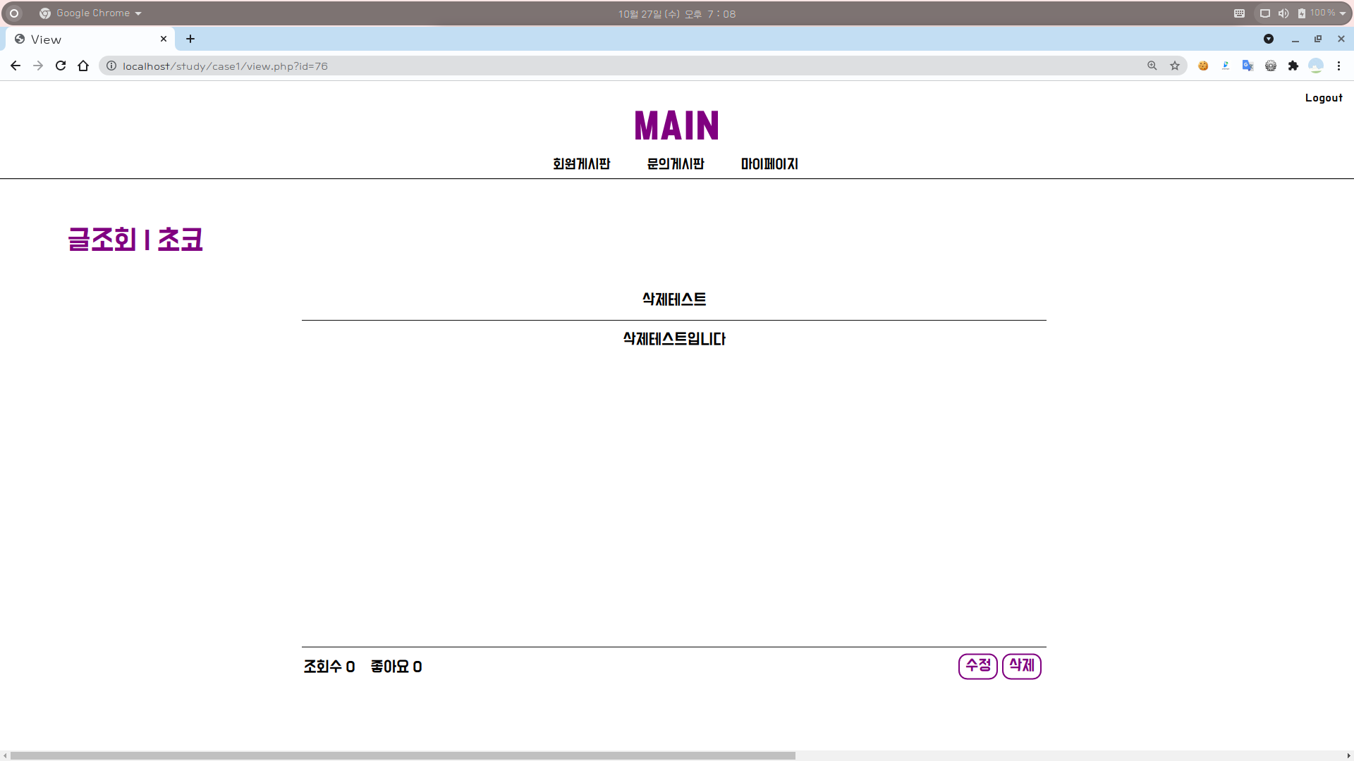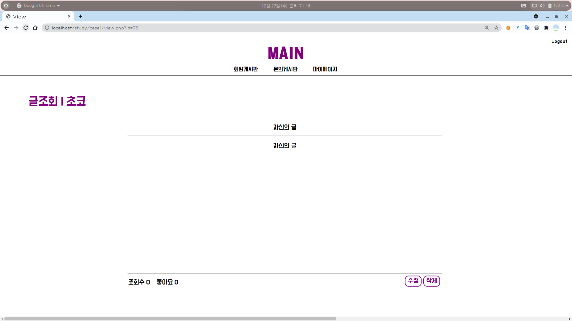 [1] 글조회 시 해당 게시글이 자신이 쓴 글이면 우측 하단에 [수정] [삭제] 버튼이 나타난다.