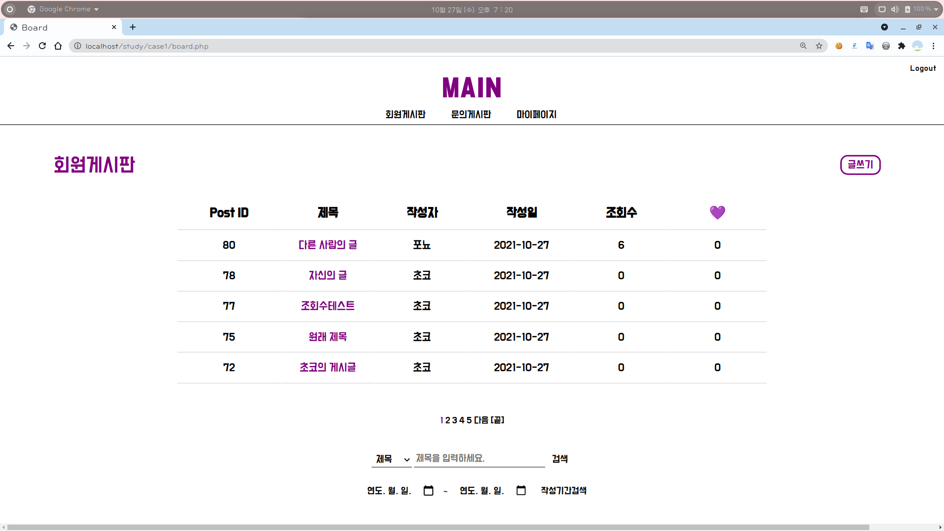 | [웹개발] 웹 최종 한 눈에 보기 (1) : 그리팅, 로그인, 회원가입, 메인, 글쓰기, 글조회, 게시판, 검색어로 검색, 작성기간으로 검색 (0) | 2021.10.27 |