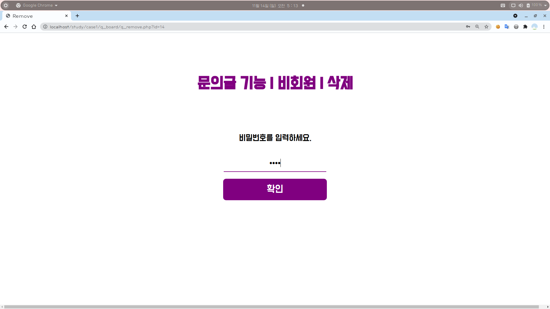 [5-1] 비밀번호가 일치하면, alert를 출력하고 문의글을 삭제한다.