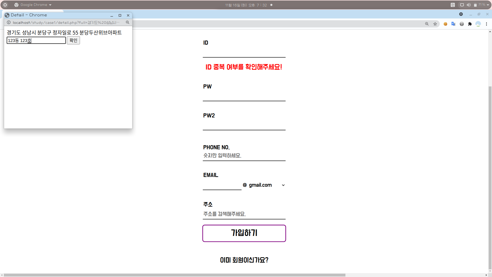 [5] 상세 주소를 입력한 후 [확인] 버튼을 누르면 자식창이 꺼지고 부모창의 주소 기입란에 해당 주소가 입력된다.
