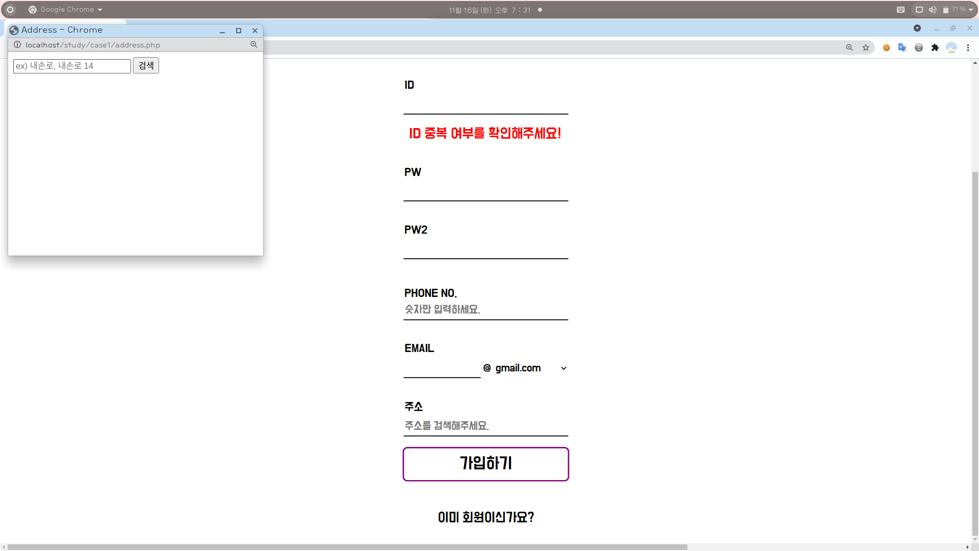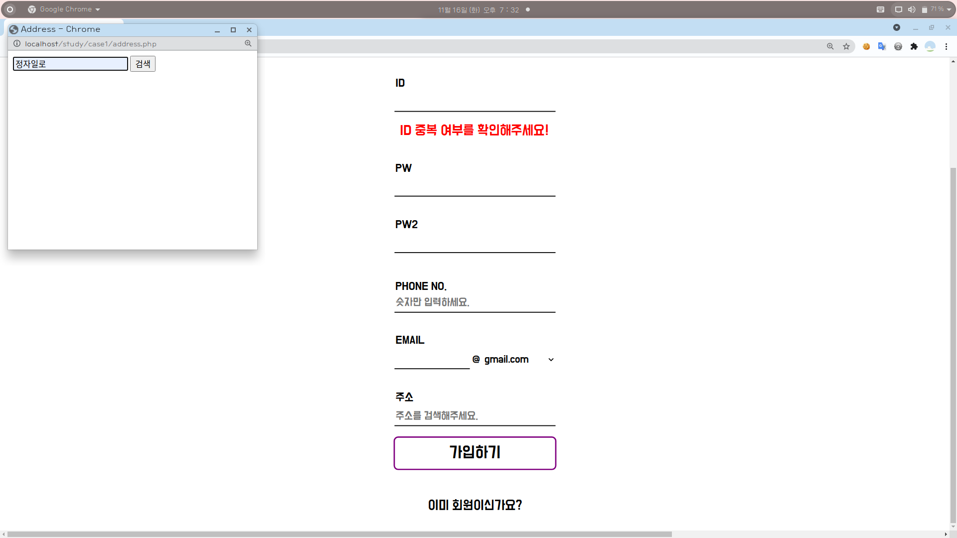 [1] 회원가입 페이지의 주소 기입란을 클릭하면 새 창이 뜬다.