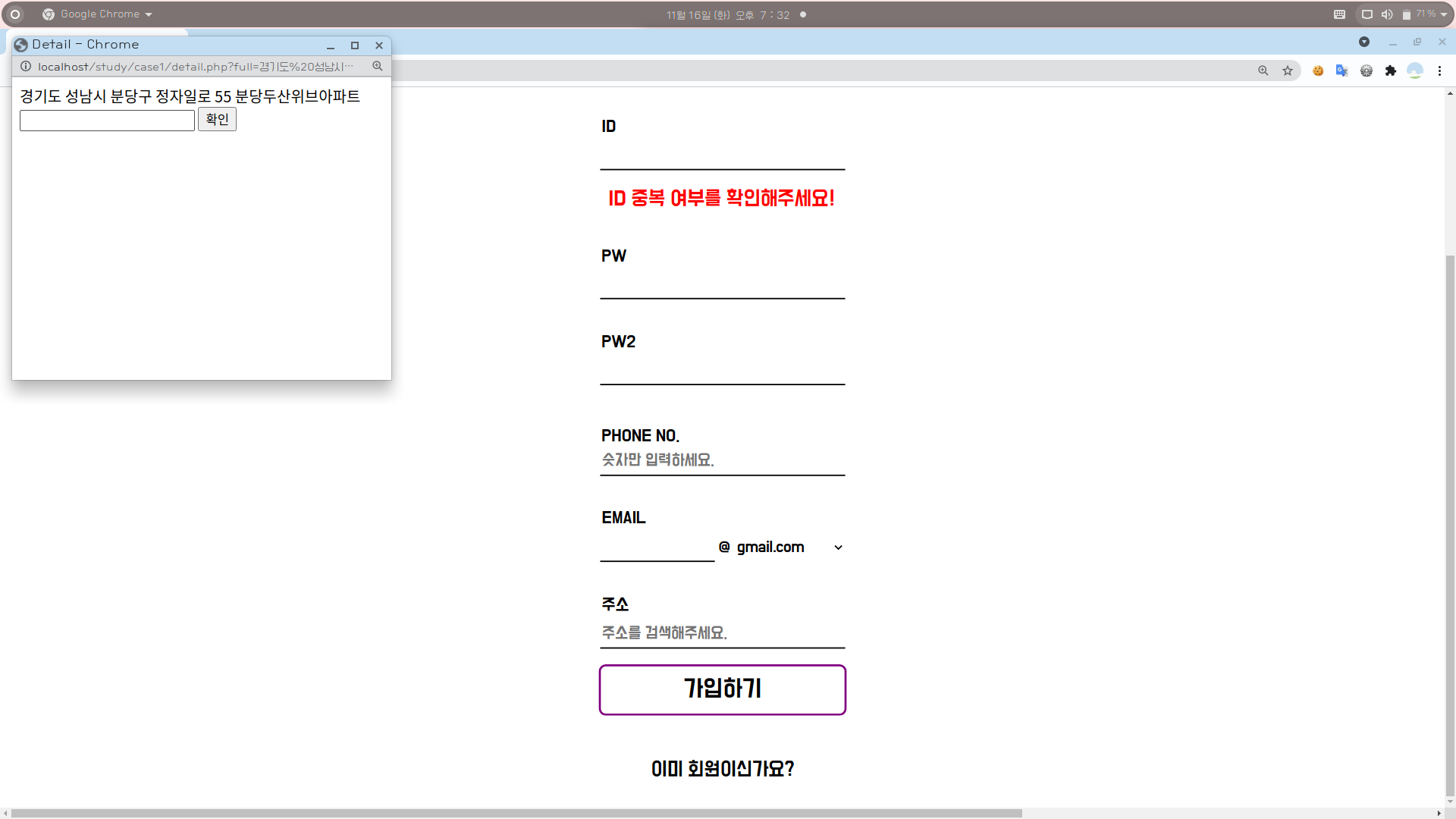 [5] 상세 주소를 입력한 후 [확인] 버튼을 누르면 자식창이 꺼지고 부모창의 주소 기입란에 해당 주소가 입력된다.