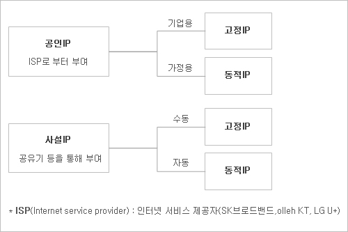 * 기업용 : 인터넷 상에서 서버를 운영하기 위해서는 따로 기업회원으로 가입하여 고정 IP인 공인 IP를 부여받아야 한다.