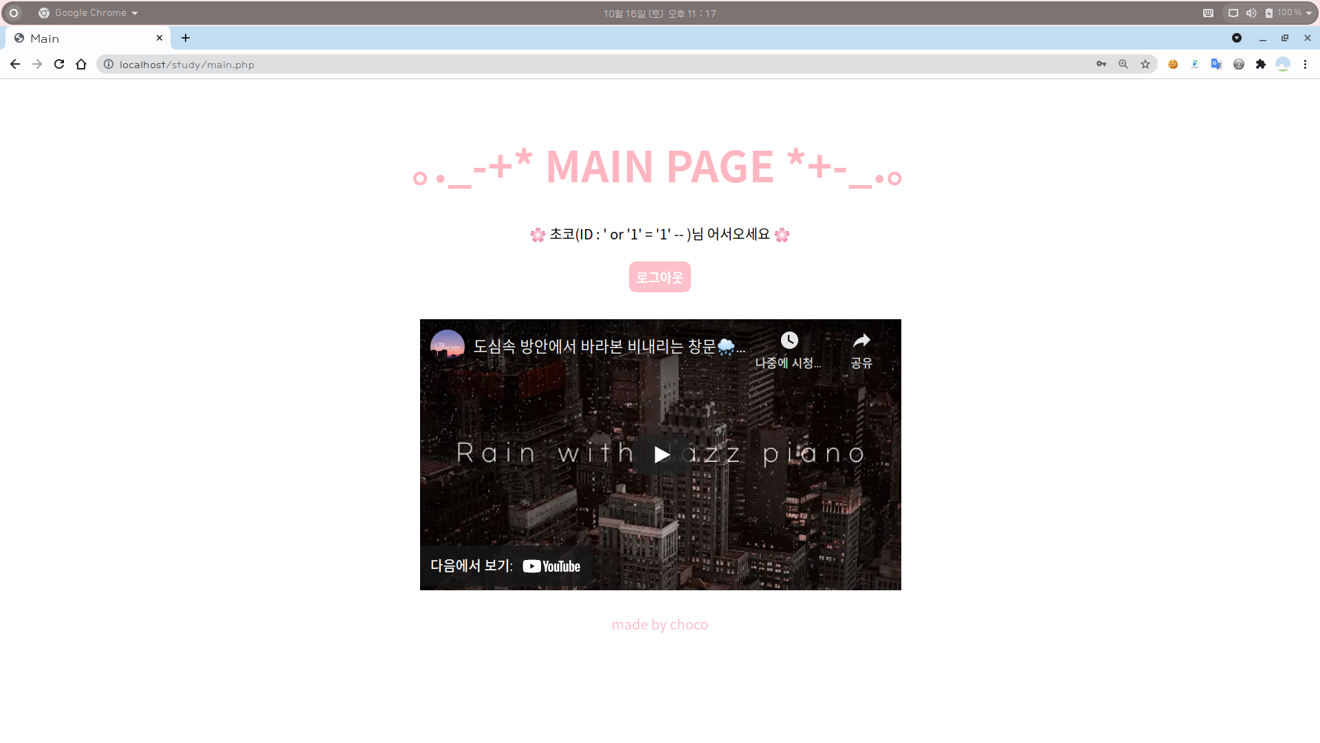 - PW를 입력하지 않아도 Query문 상에서는 TRUE지만 개발 과정에서 PW 폼을 required 처리해놨기 때문에 아무 값이나 입력해준다. 또한 다른 조건에 걸리게 되는 경우가 있으니 가급적 입력해준다. PW가 틀려도 Query문에 의해 모두 TRUE 처리가 되니 걱정하지 말자.