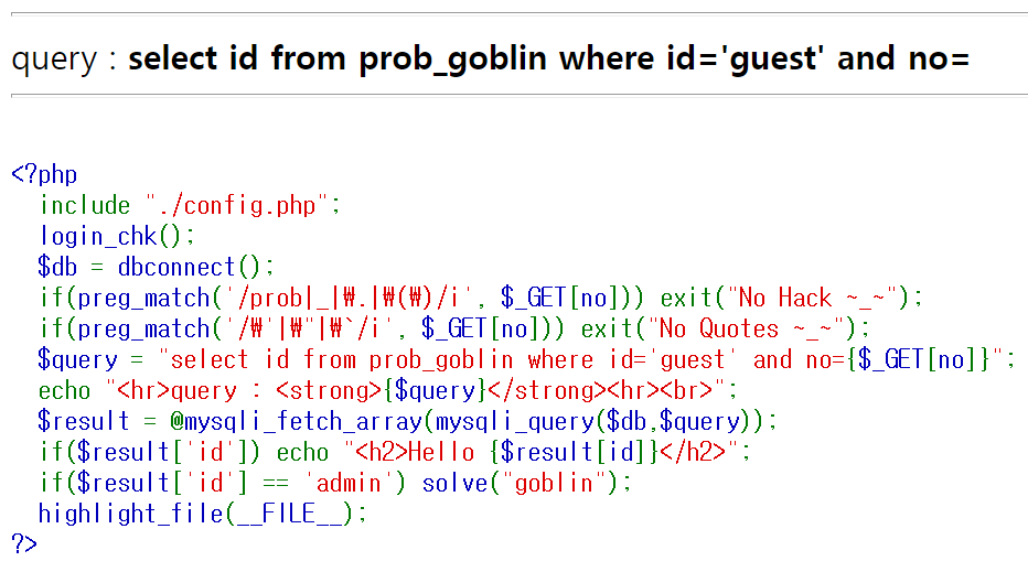 $query = "select id from prob_goblin where id='guest' and no={$_GET[no]}"
