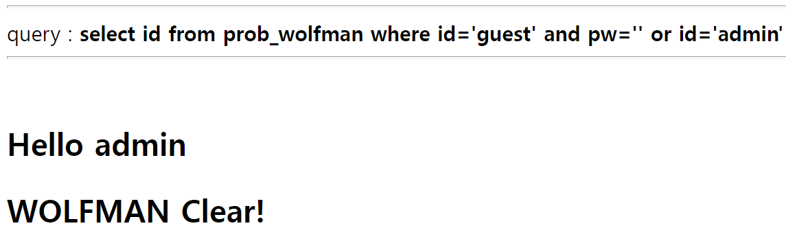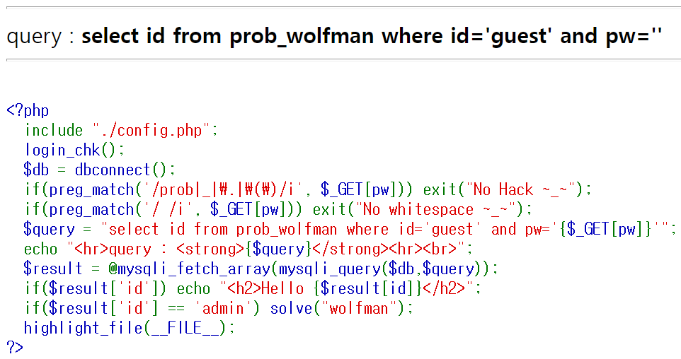 $query = "select id from prob_wolfman where id='guest' and pw='{$_GET[pw]}'";