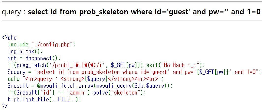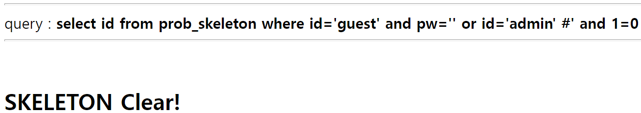 $query = "select id from prob_skeleton where (id='guest' and pw='') or id='admin' #' and 1=0";
