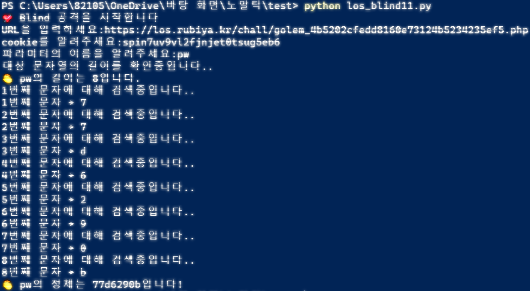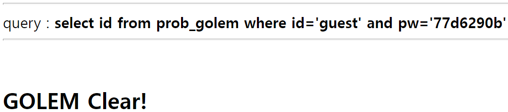 Blind 공격 결과, admin의 pw는 77d6290b 임을 알 수 있다.
